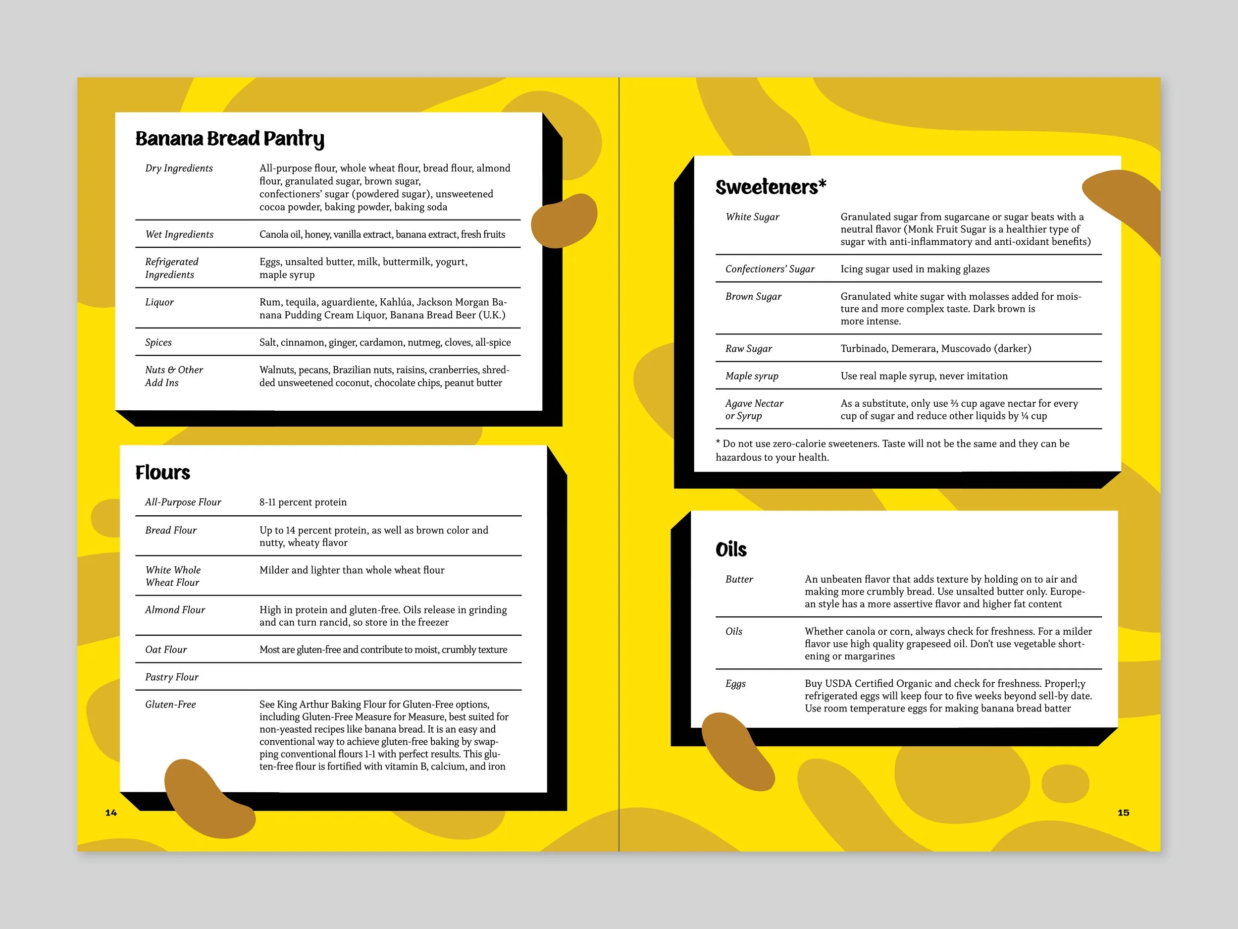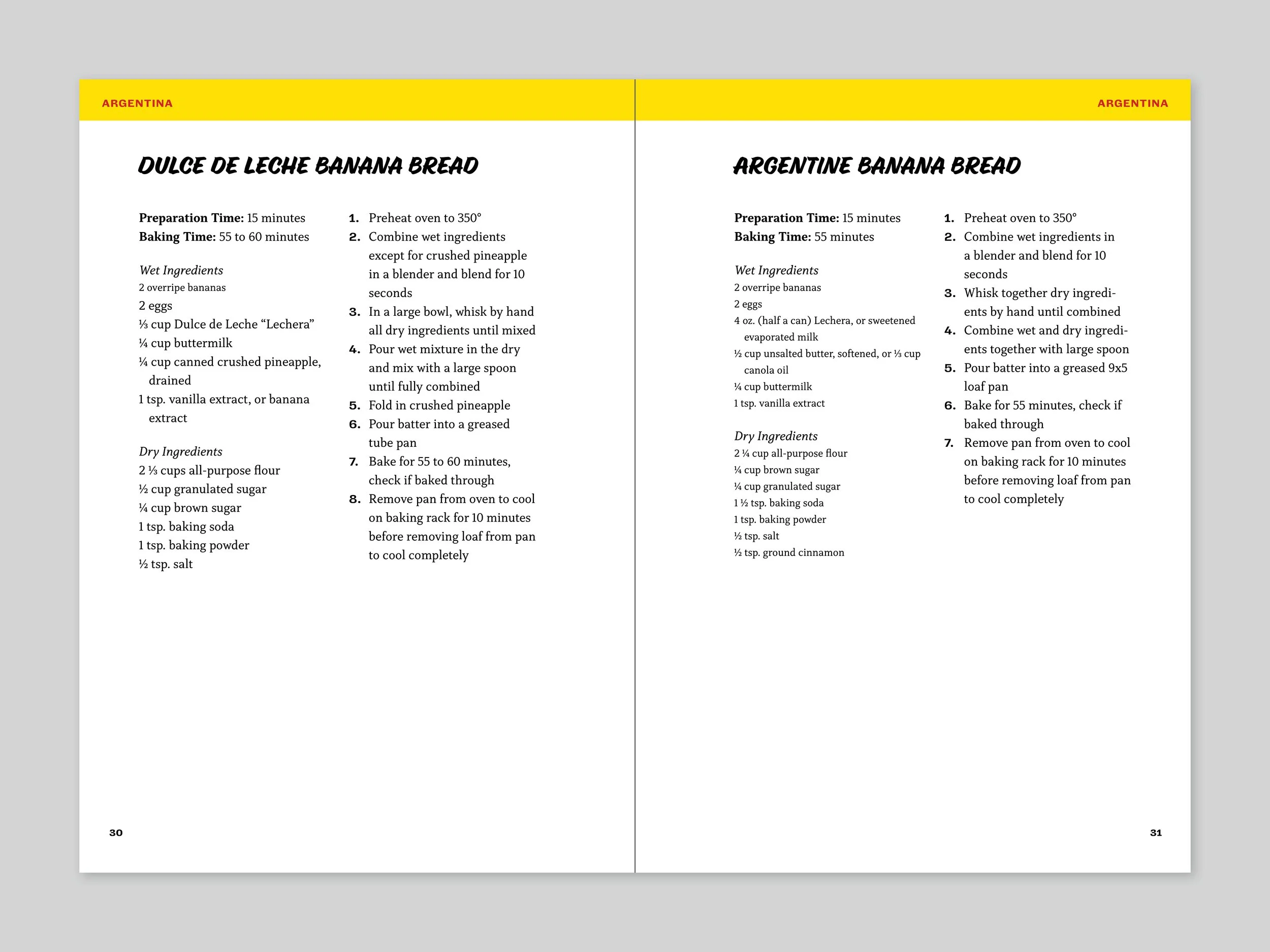 You’d be hard-pressed to find a more comprehensive volume on banana bread than this one! How else could we have presented over 70 award-winning banana bread recipes, not to mention the history of banana bread, short stories on banana bread, and a breakdown of the individual ingredients in banana bread, than to go bananas? The design goal was to present the book as a one-stop-shop for all your banana bread needs. We pulled the color scheme and custom design motifs from a banana’s browning complexion, the tell-tale sign that your fruit is ready to become dessert. The recipes were then organized by their country of origin, with the typography borrowed from images of Latin American fruit markets I had sourced during the research stage.