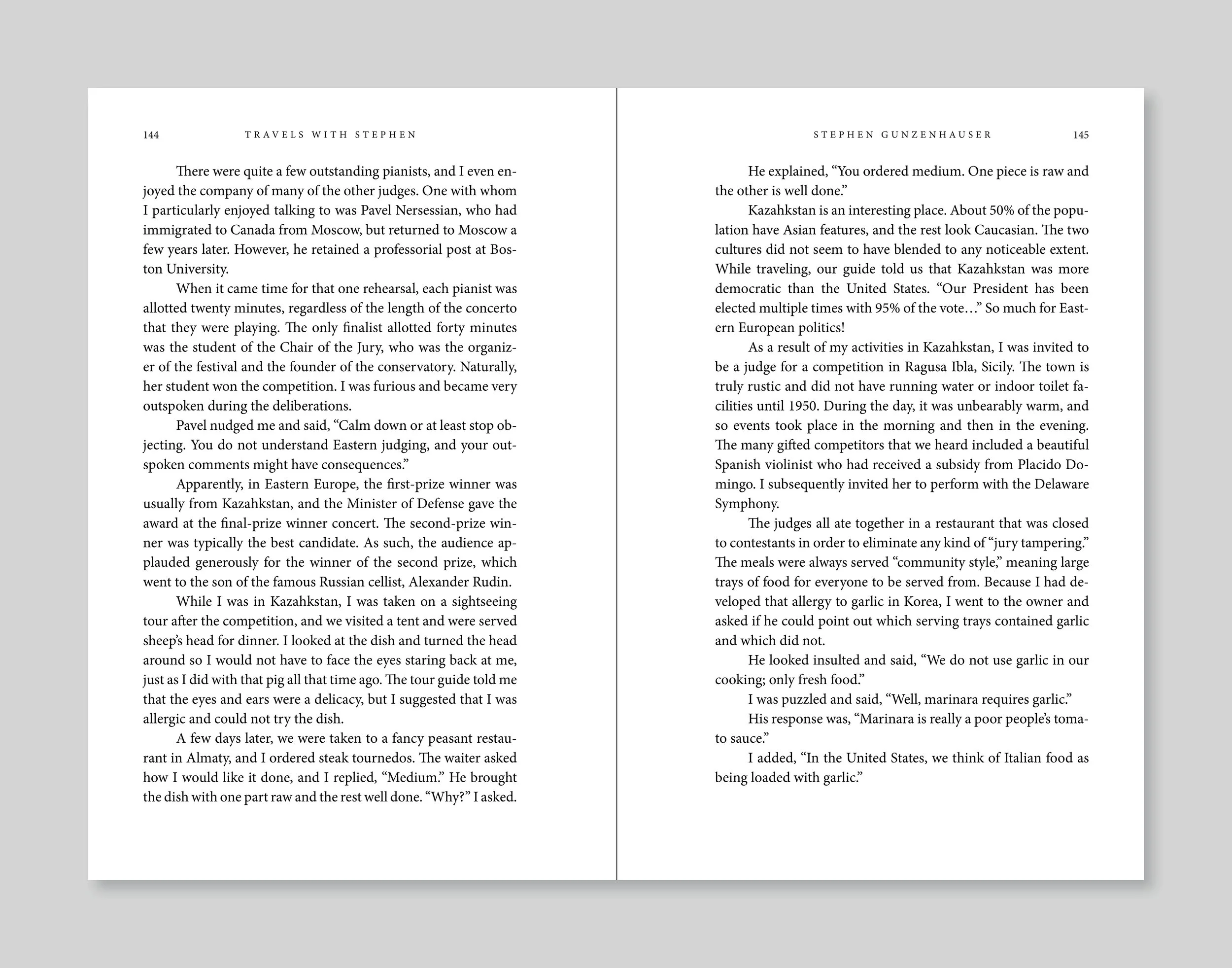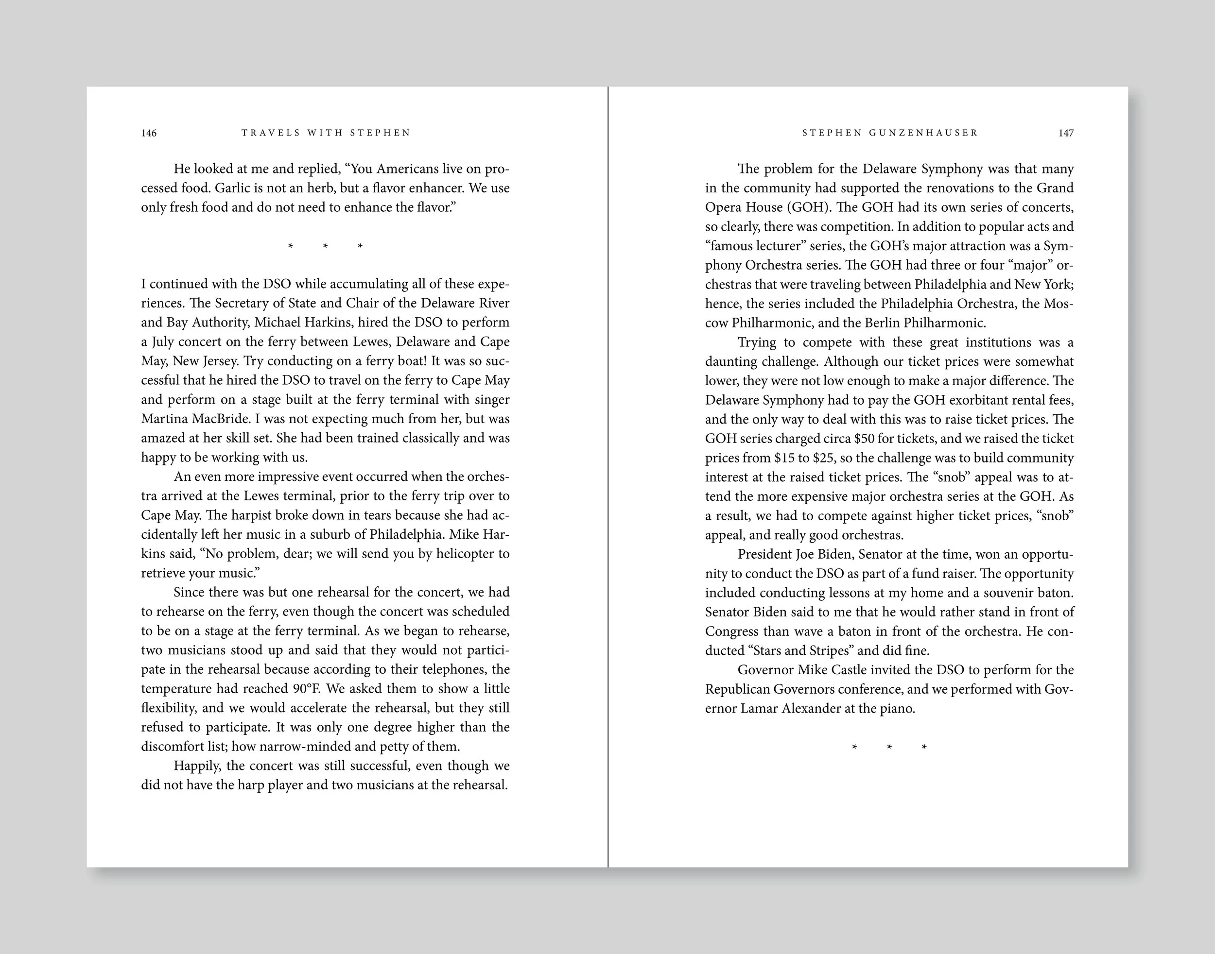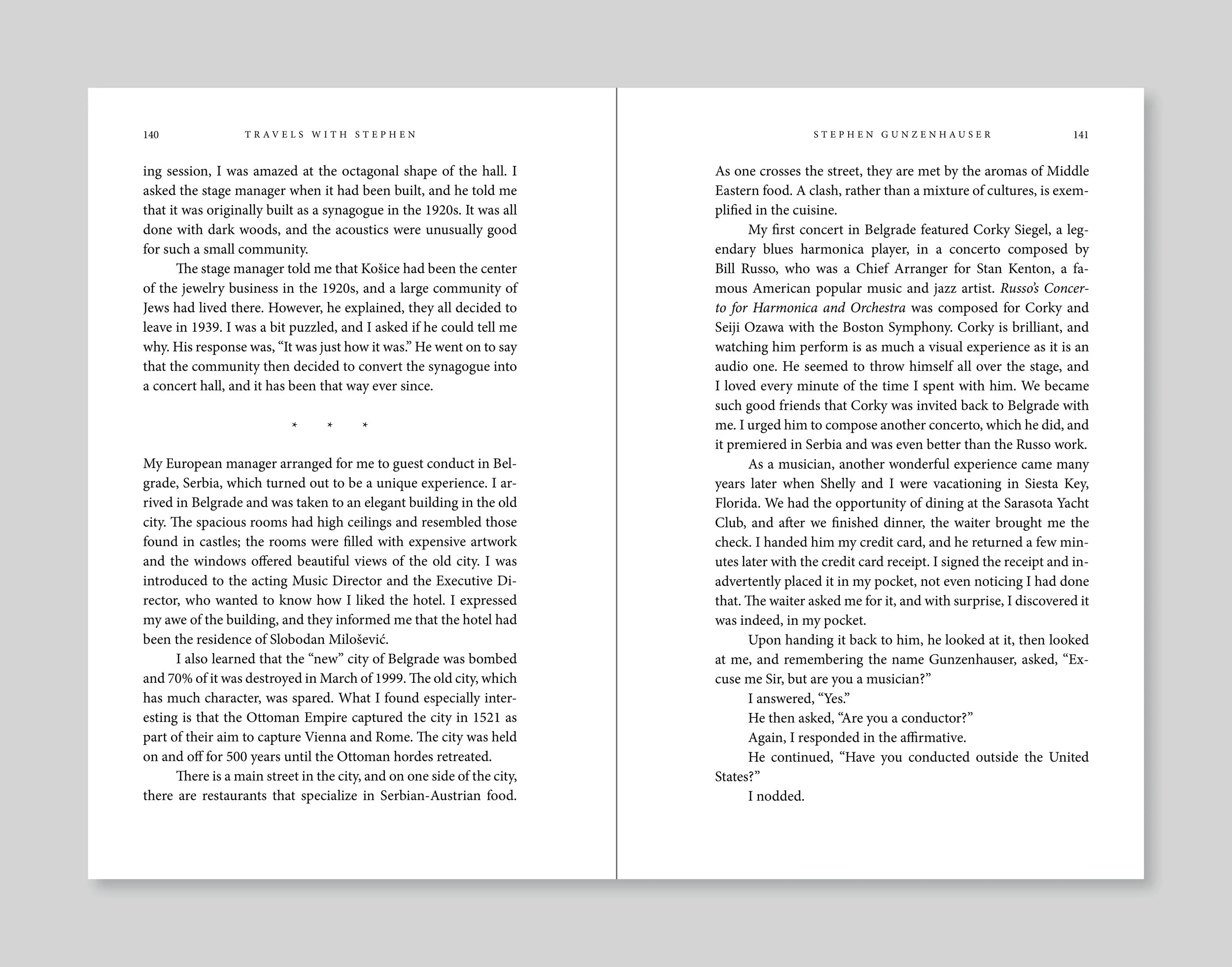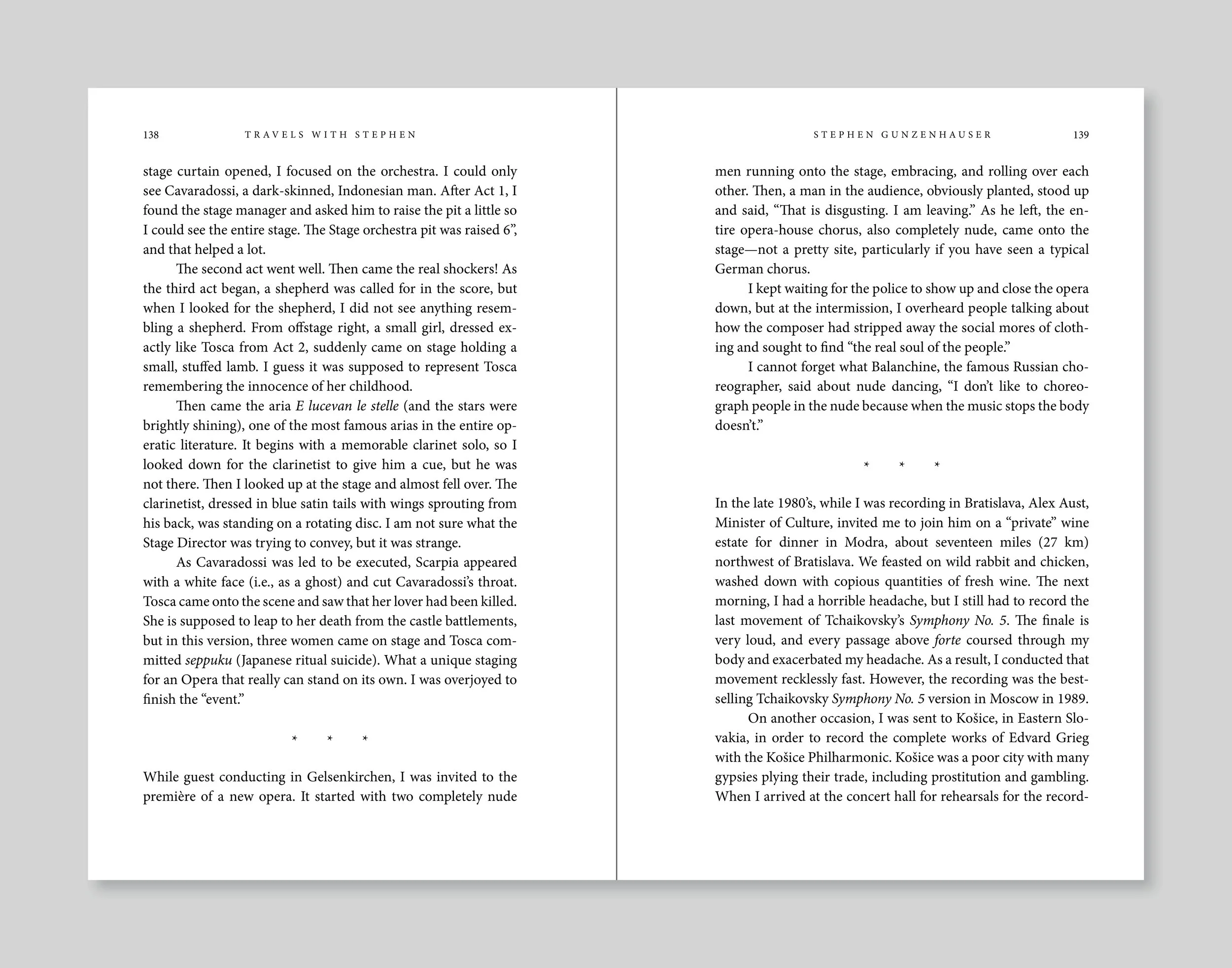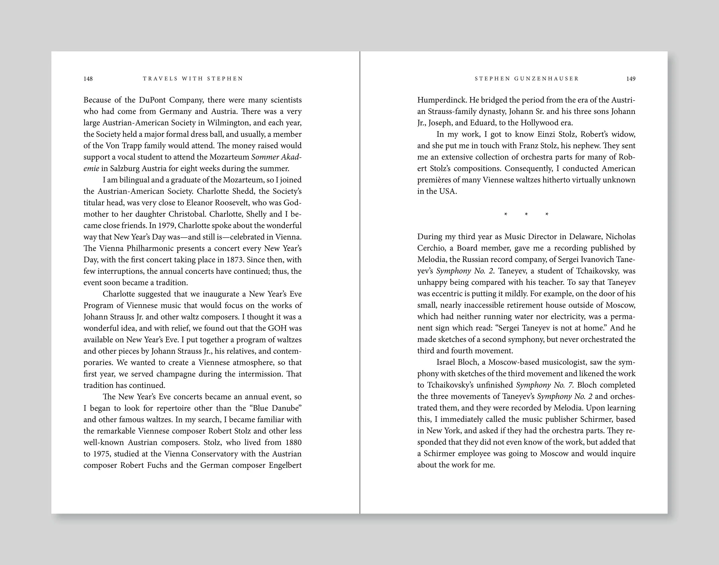 Conductor and author Stephen Gunzenhauser wanted a “classic” look for his memoir, with his stories presented simply and cleanly. I was happy to deliver a volume typeset in Minion, with drop caps and small caps providing an appropriate formality to the introduction of each chapter. Straightforward, effective, “classic.”