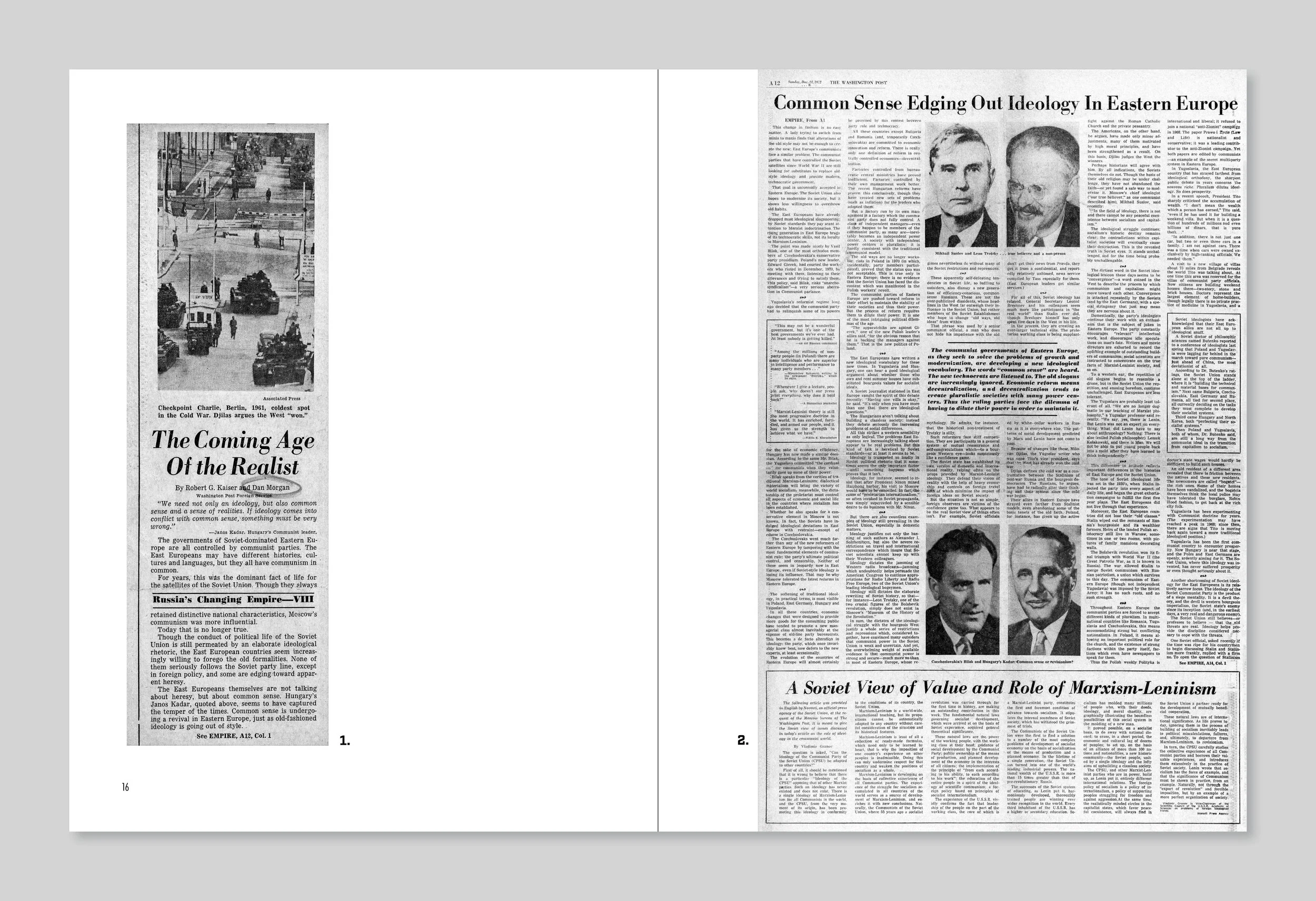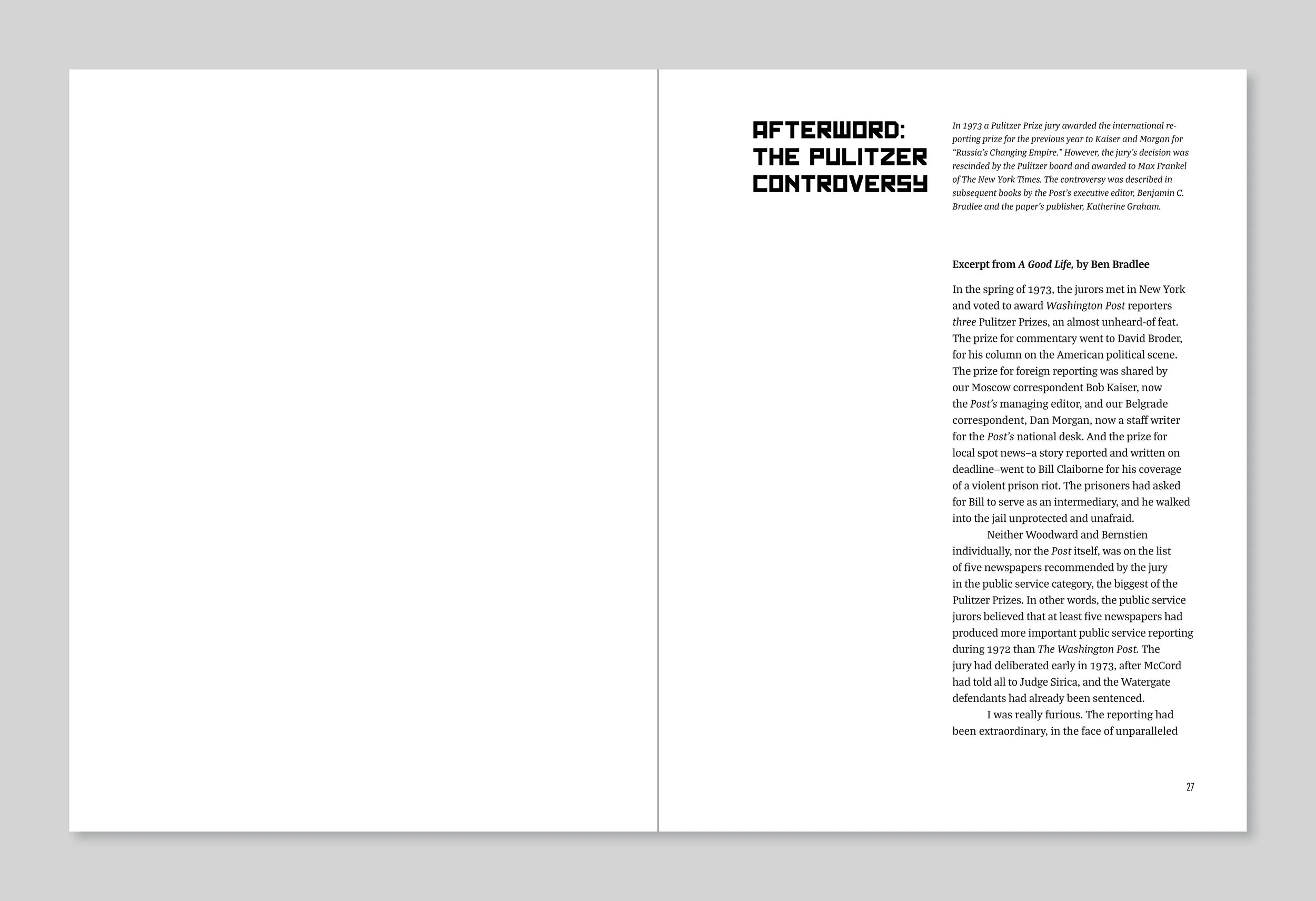 When Dan approached me with these beautiful scans of the Pulitzer Prize-nominated article he had co-written back in 1972, I knew we had to put together a package that did them justice. We arrived at a layout that let the article speak for itself. To help it stand alone, I took full advantage of the maximum available trim size and the extended bleed I added to the scans, stretching them to fill almost the entire page. For the cover, we made a few modifications to a cartoon featured in the original piece, taking more than a little inspiration from Post-Revolution Constructivists. It was an honor to aid in preserving and presenting such a high-quality piece of long-form journalism, something that seems to be falling more and more to the wayside in today’s media frenzy.